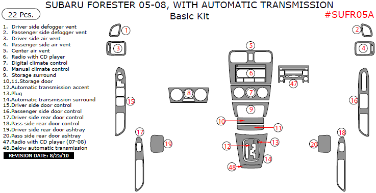 Subaru Forester 2005, 2006, 2007, 2008, With Automatic Transmission, Basic Interior Kit, 22 Pcs.