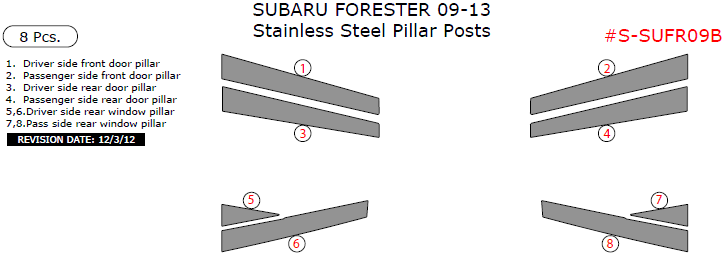 We offer a wide variety of colors and materials of Subaru Forester 2009, 2010, 2011, 2012, 2013, Stainless Steel Pillar Posts, 8 Pcs. Choose your favourite option and place an order.