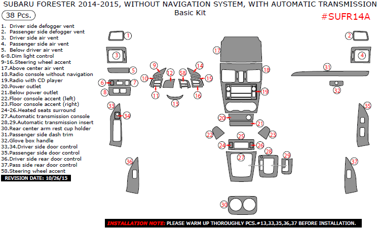 Subaru Forester 2014-2015, Without Navigation System, With Automatic Transmission, Basic Interior Kit, 38 Pcs.