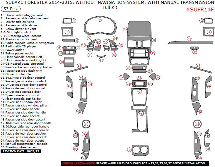 Subaru Forester 2014-2015, Without Navigation System, With Manual Transmission, Full Interior Kit, 53 Pcs.