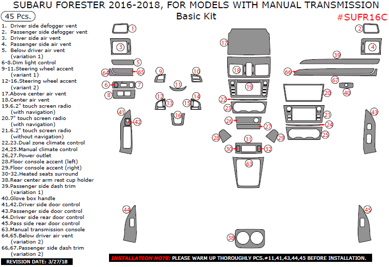 Subaru Forester 2016, 2017, 2018, For Models With Manual Transmission, Basic Interior Kit, 45 Pcs.
