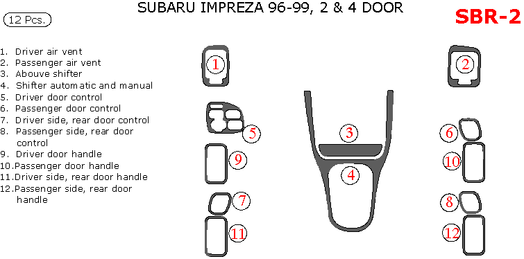 Subaru Impreza 1996, 1997, 1998, 1999, Full Interior Kit, 12 Pcs.