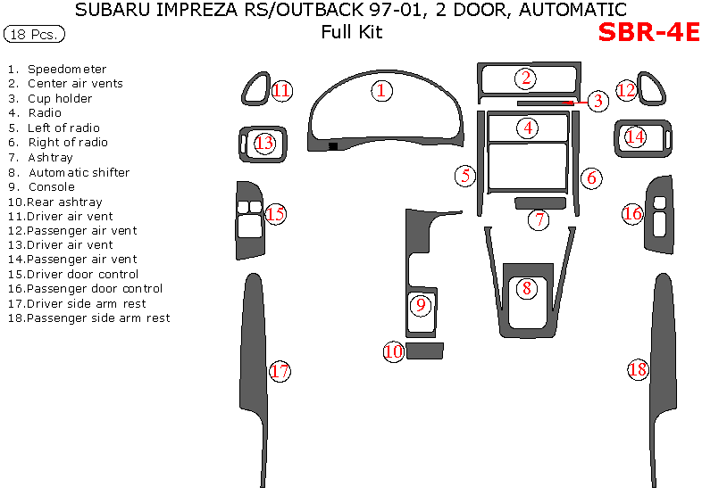 We offer a wide variety of colors and materials of Subaru Impreza 1997, 1998, 1999, 2000, 2001, RS/Outback, 2 Door, Automatic, Full Interior Kit, 18 Pcs. Choose your favourite option and place an order.