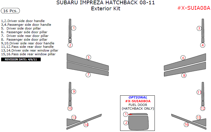 Subaru Impreza 2008, 2009, 2010, 2011, Exterior Kit (Hatchback Only), 16 Pcs.