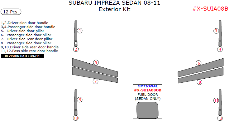 We offer a wide variety of colors and materials of Subaru Impreza 2008, 2009, 2010, 2011, Exterior Kit (Sedan Only), 12 Pcs. Choose your favourite option and place an order.