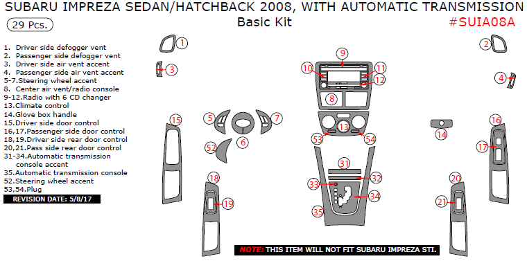 Subaru Impreza 2008, Sedan/Hatchback, With Automatic Transmission, Basic Interior Kit, 29 Pcs.