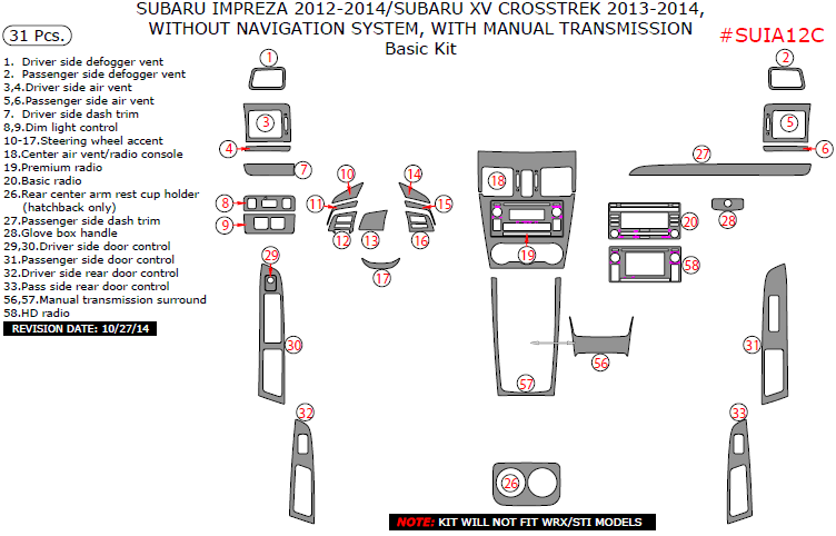 Subaru Impreza 2012, 2013, 2014, Subaru XV Crosstrek 2013-2014, Without Navigation System, With Manual Transmission, Basic Interior Kit, 31 Pcs.