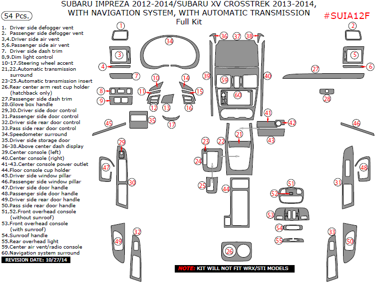 Subaru Impreza 2012, 2013, 2014, Subaru XV Crosstrek 2013-2014, With Navigation System, With Automatic Transmission, Full Interior Kit, 54 Pcs.