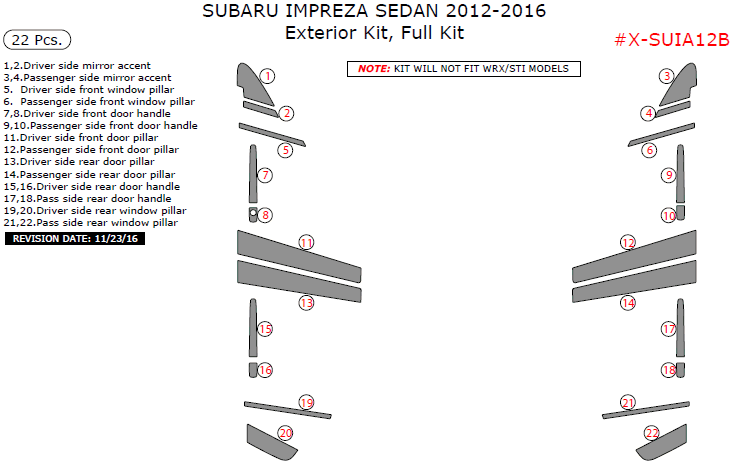 Subaru Impreza Sedan 2012, 2013, 2014, 2015, 2016, Exterior Kit, Full Interior Kit, 22 Pcs.