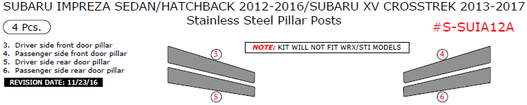 We offer a wide variety of colors and materials of Subaru Impreza Sedan/Hatchback 2012, 2013, 2014, 2015, 2016/Subaru XV Crosstrek 2013, 2014, 2015, 2016, 2017, Stainless Steel Pillar Posts, 4 Pcs. Choose your favourite option and place an order.