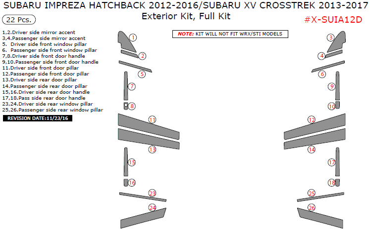 Subaru Impreza Hatchback 2012, 2013, 2014, 2015, 2016/Subaru XV Crosstrek 2013-2017, Exterior Kit, Full Interior Kit, 22 Pcs.