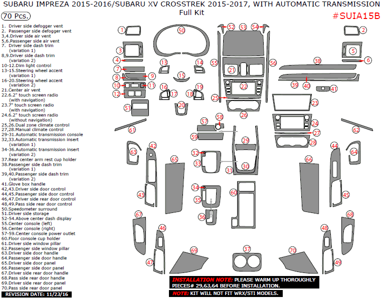 Subaru Impreza 2015-2016/Subaru XV Crosstrek 2015, 2016, 2017, With Automatic Transmission, Full Interior Kit, 70 Pcs.