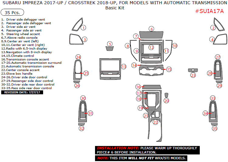 Subaru Impreza 2017-2018/Crosstrek 2018-2023, For Models With Automatic Transmission, Basic Interior Kit, 35 Pcs.
