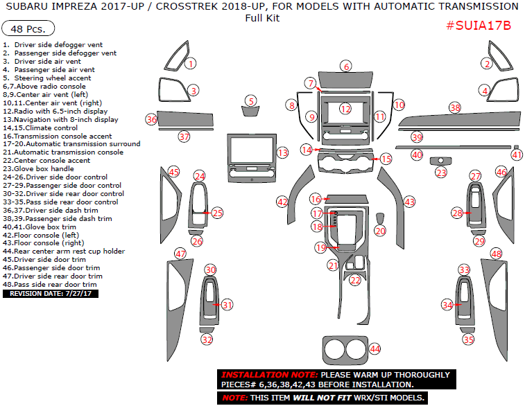 Subaru Impreza 2017-2018/Crosstrek 2018-2023, For Models With Automatic Transmission, Full Interior Kit, 48 Pcs.