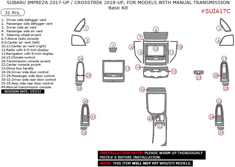 Subaru Impreza 2017-2018/Crosstrek 2018-2023, For Models With Manual Transmission, Basic Interior Kit, 31 Pcs.
