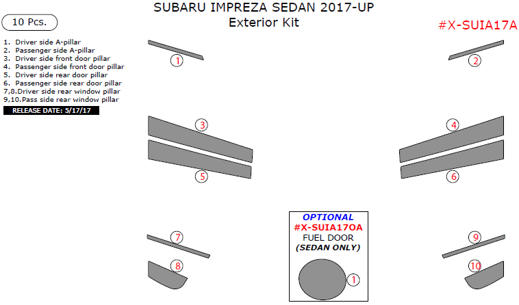Subaru Impreza Sedan 2017-2023, Exterior Kit, 10 Pcs.