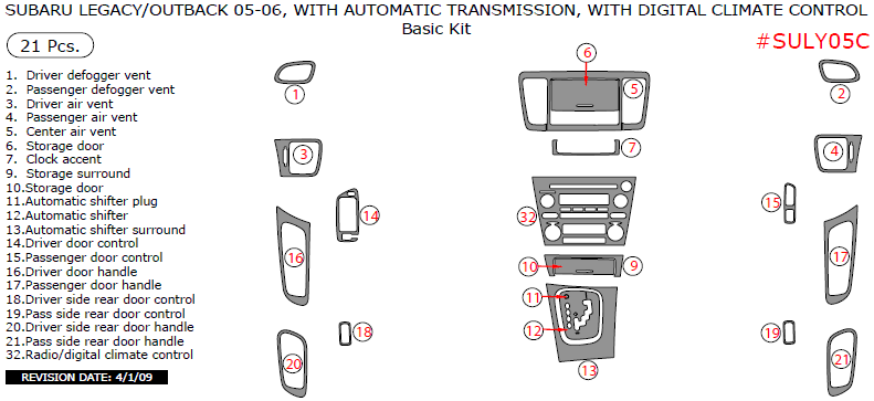 Subaru Outback 2005-2006, With Automatic Transmission, With Digital Climate Control, Basic Interior Kit, 21 Pcs.