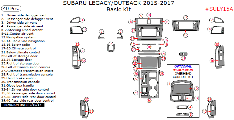 Subaru Legacy/Outback 2015, 2016, 2017, Basic Interior Kit, 40 Pcs.