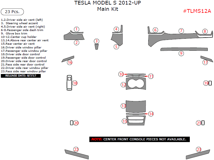 Tesla Model S 2012, 2013, 2014, 2015, 2016, 2017, Main Interior Kit, 23 Pcs.