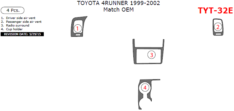 Toyota 4Runner 1999, 2000, 2001, 2002, Interior Dash Kit, Match OEM, 4 Pcs.