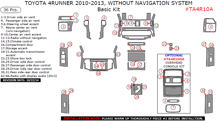 Toyota 4Runner 2010, 2011, 2012, 2013, Without Navigation System, Basic Interior Kit, 36 Pcs.