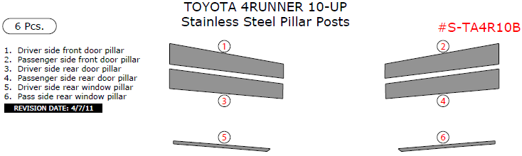 We offer a wide variety of colors and materials of Toyota 4Runner 2010, 2011, 2012, 2013, 2014, 2015, 2016, 2017, 2018, 2019, 2020, 2021, 2022, 2023, 2024, 2025, Stainless Steel Pillar Posts, 6 Pcs. Choose your favourite option and place an order.