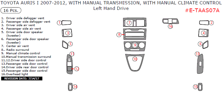 We offer a wide variety of colors and materials of Toyota Auris I 2007, 2008, 2009, 2010, 2011, 2012, With Manual Transmission, With Manual Climate Control, Main Interior Kit (Left Hand Drive), 16 Pcs. Choose your favourite option and place an order.