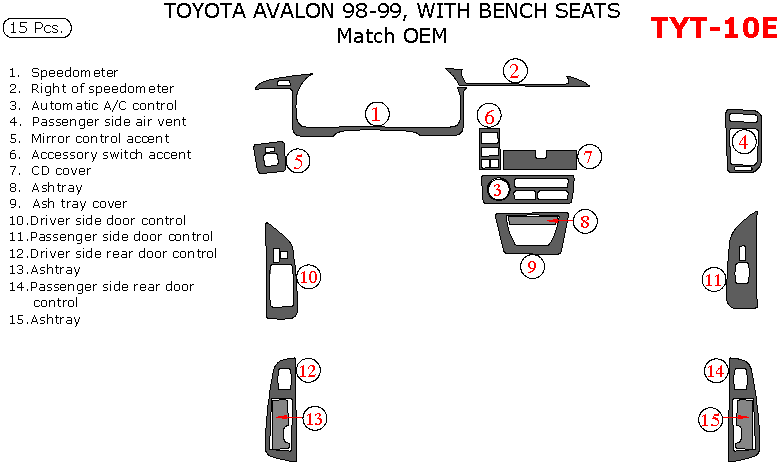 Toyota Avalon 1995, 1996, 1997, 1998, 1999, Interior Dash Kit, Bench Seats, 15 Pcs., Match OEM