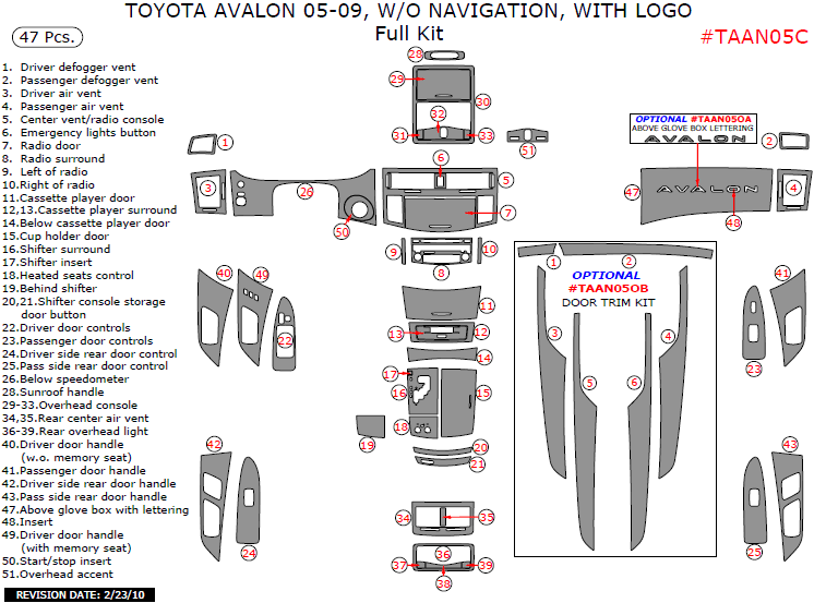Toyota Avalon 2005, 2006, 2007, 2008, 2009, Without Navigation, With Logo, Full Interior Kit, 47 Pcs.