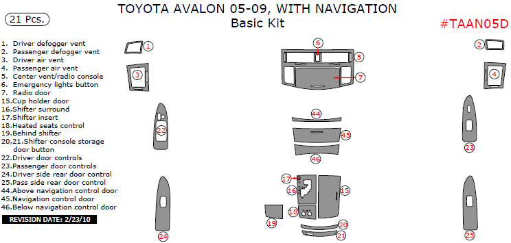 Toyota Avalon 2005, 2006, 2007, 2008, 2009, With Navigation, Basic Interior Kit, 21 Pcs.