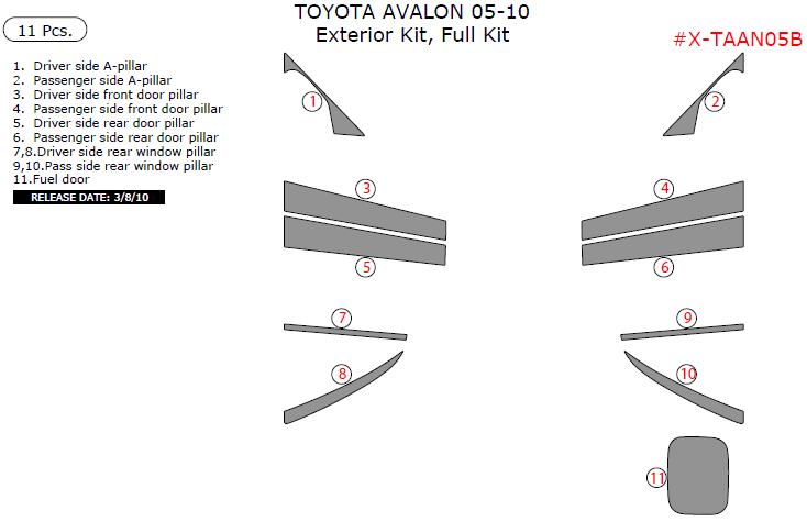 Toyota Avalon 2005, 2006, 2007, 2008, 2009, 2010, Exterior Kit, Full Interior Kit, 11 Pcs.