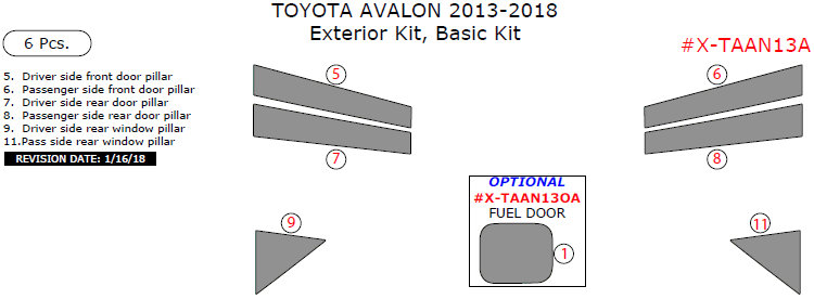 Toyota Avalon 2013, 2014, 2015, 2016, 2017, 2018, 2019, Basic Exterior Kit, 6 Pcs.
