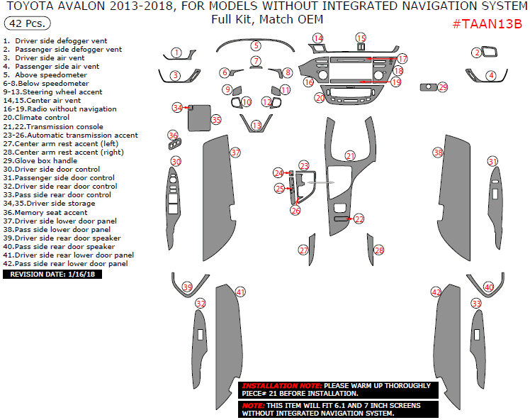Toyota Avalon 2013, 2014, 2015, 2016, 2017, 2018, 2019, For Models Without Integrated Navigation System, Full Interior Kit, 42 Pcs., Match OEM