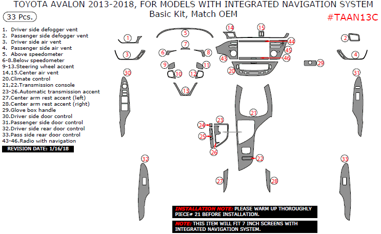 Toyota Avalon 2013, 2014, 2015, 2016, 2017, 2018, 2019, For Models With Integrated Navigation System, Basic Interior Kit, 33 Pcs., Match OEM