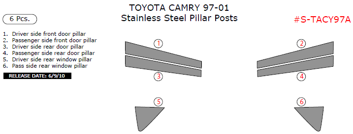 We offer a wide variety of colors and materials of Toyota Camry 1997, 1998, 1999, 2000, 2001, Stainless Steel Pillar Posts, 6 Pcs. Choose your favourite option and place an order.