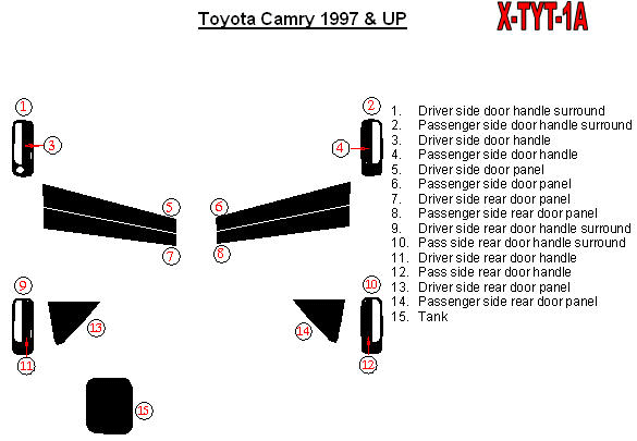 We offer a wide variety of colors and materials of Toyota Camry 1997, 1998, 1999, 2000, 2001, Exterior Trim Kit, 15 Pcs. Choose your favourite option and place an order.