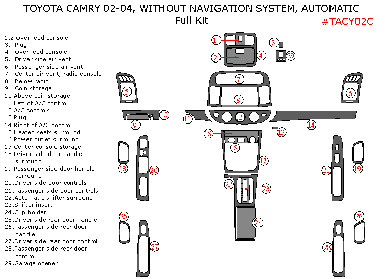 Toyota Camry 2002, 2003, 2004, Without Navigation System, Automatic, Full Interior Kit, 29 Pcs.