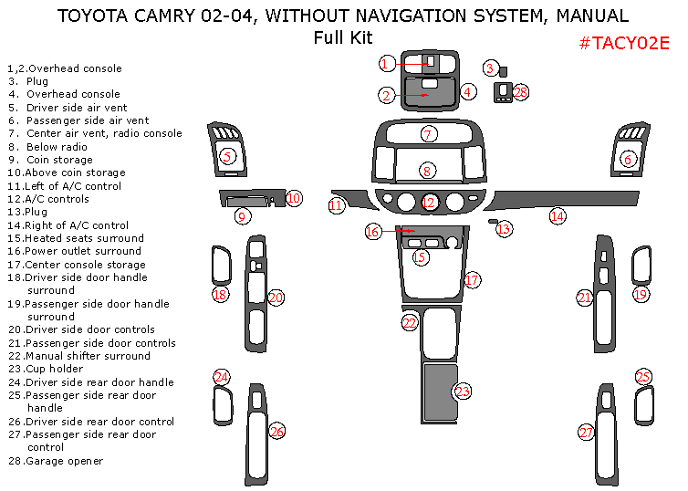 Toyota Camry 2002, 2003, 2004, Without Navigation System, Manual, Full Interior Kit, 28 Pcs.,.