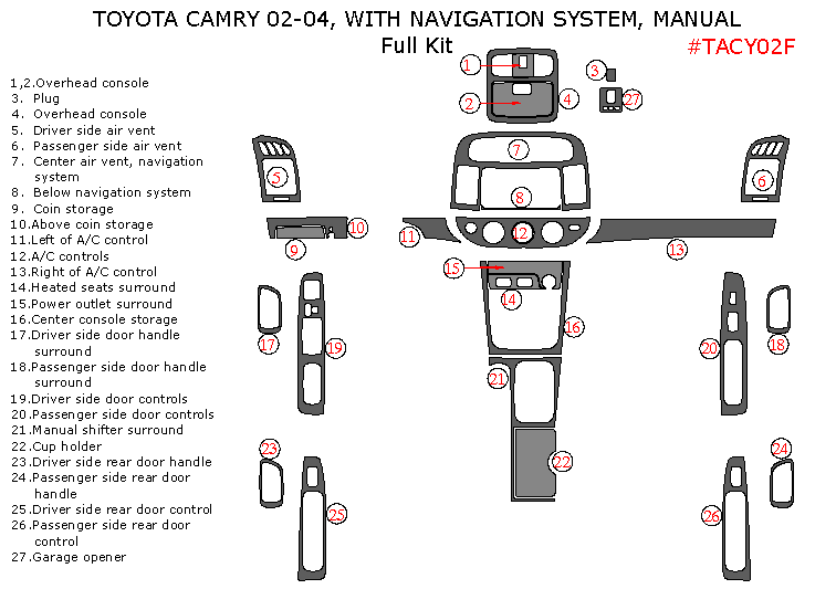 Toyota Camry 2002, 2003, 2004, With Navigation System, Manual, Full Interior Kit, 27 Pcs.,