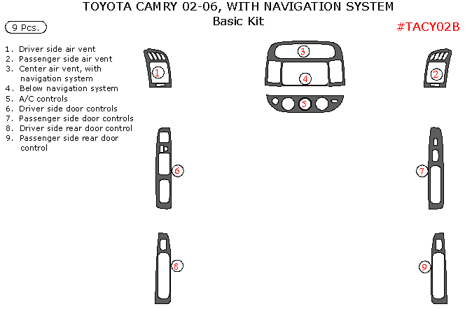 Toyota Camry 2002, 2003, 2004, 2005, 2006, With Navigation System, Basic Interior Kit, 9 Pcs.,