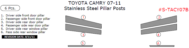 We offer a wide variety of colors and materials of Toyota Camry 2007, 2008, 2009, 2010, 2011, Stainless Steel Pillar Posts, 6 Pcs. Choose your favourite option and place an order.