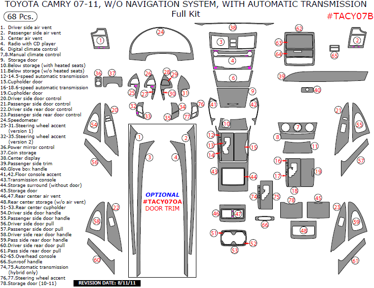 Toyota Camry 2007, 2008, 2009, 2010, 2011, Without Navigation System, With Automatic Transmission, Full Interior Kit, 68 Pcs.