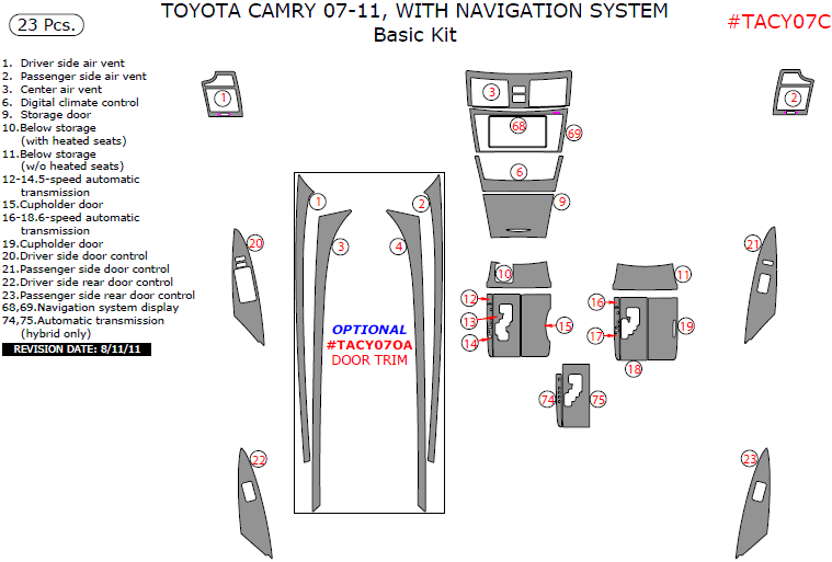We offer a wide variety of colors and materials of Toyota Camry 2007, 2008, 2009, 2010, 2011, With Navigation System, Basic Interior Kit, 23 Pcs. Choose your favourite option and place an order.