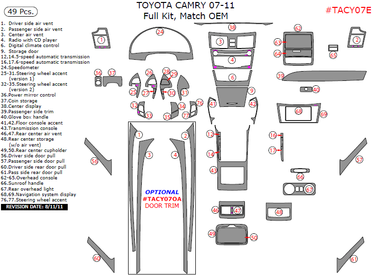 We offer a wide variety of colors and materials of Toyota Camry 2007, 2008, 2009, 2010, 2011, Full Interior Kit, 49 Pcs., Match OEM. Choose your favourite option and place an order.