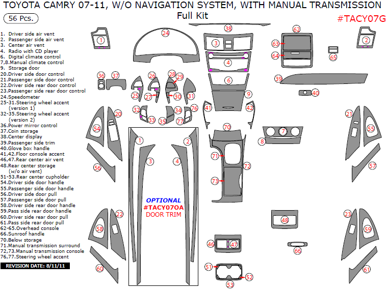 Toyota Camry 2007, 2008, 2009, 2010, 2011, Without Navigation System, With Manual Transmission, Full Interior Kit, 56 Pcs.