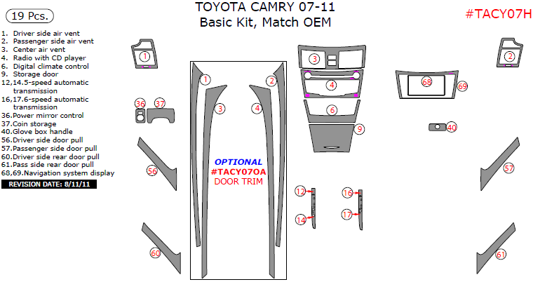 We offer a wide variety of colors and materials of Toyota Camry 2007, 2008, 2009, 2010, 2011, Basic Interior Kit, 19 Pcs., Match OEM. Choose your favourite option and place an order.