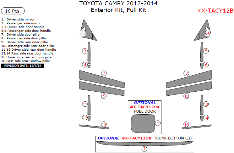 Toyota Camry 2012, 2013, 2014, Exterior Kit, Full Interior Kit, 16 Pcs.