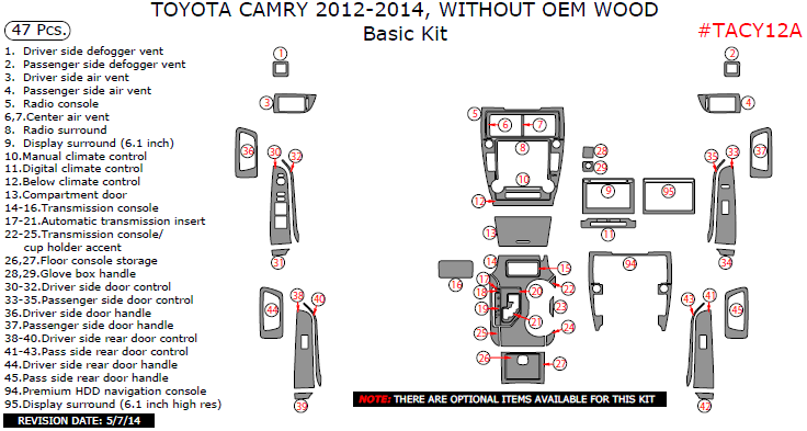 Toyota Camry 2012, 2013, 2014, Without OEM Wood, Basic Interior Kit, 47 Pcs.
