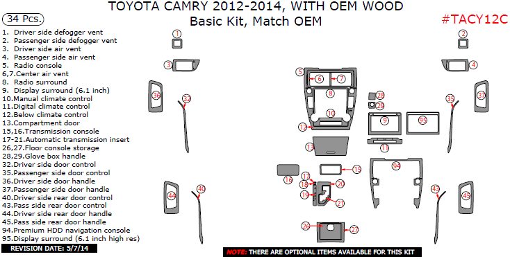 Toyota Camry 2012, 2013, 2014, With OEM Wood, Basic Interior Kit, 34 Pcs., Match OEM