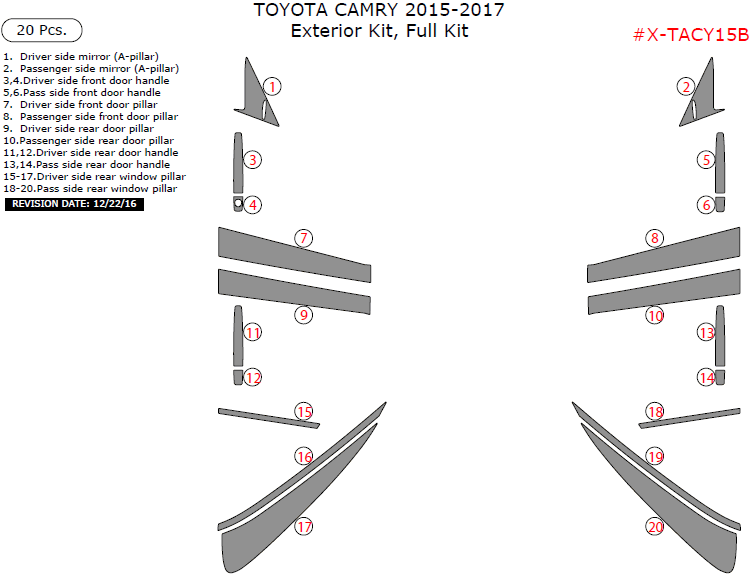 Toyota Camry 2015, 2016, 2017, Exterior Kit, Full Interior Kit, 20 Pcs.